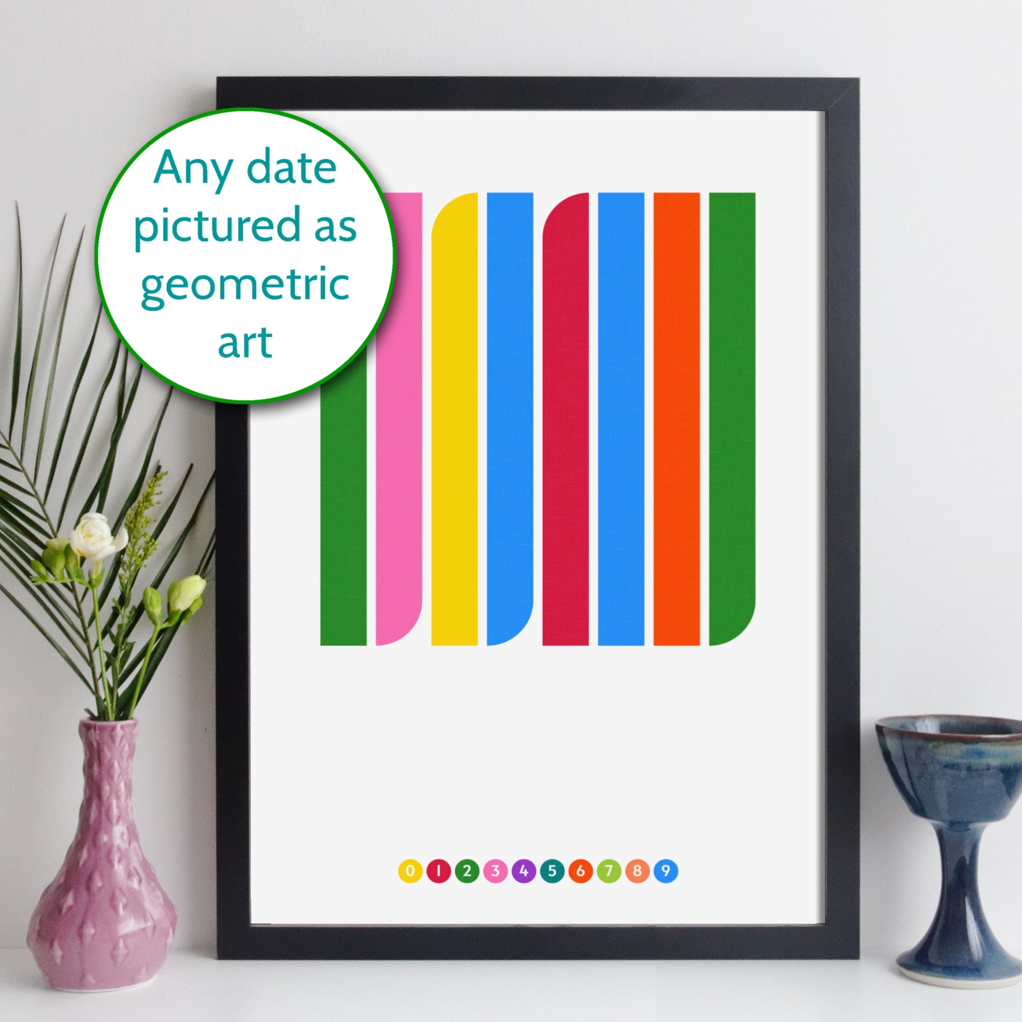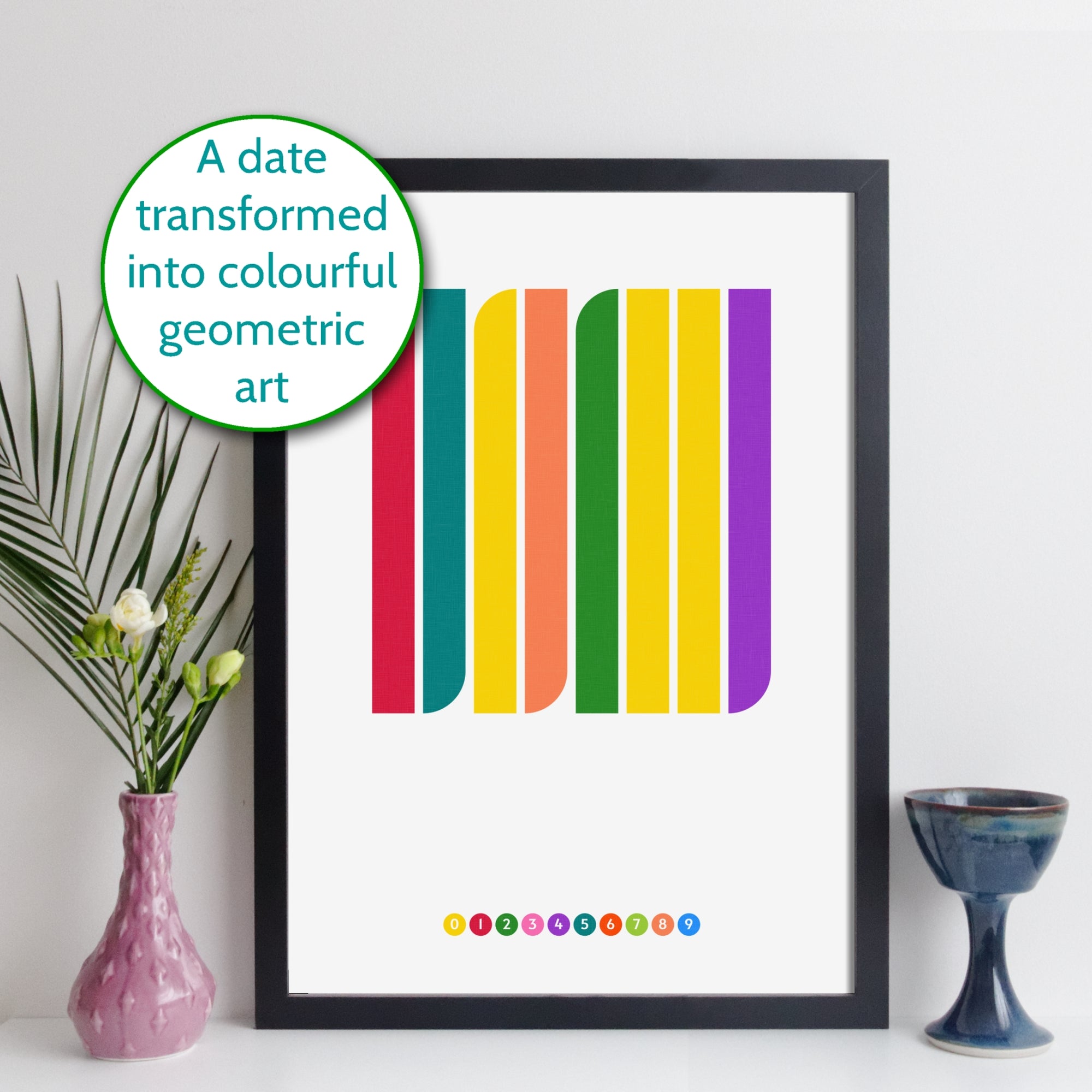 A unique piece of minimalist geometric art created using a simple idea: replace the numbers with colours. Dates are often written as a set of numbers (6th June 1967 is 06061967) - we use each of the eight digits of a date to create the art. The colour for each number appears in a row at the bottom of the print. There's an image in the gallery that shows how we create the art.