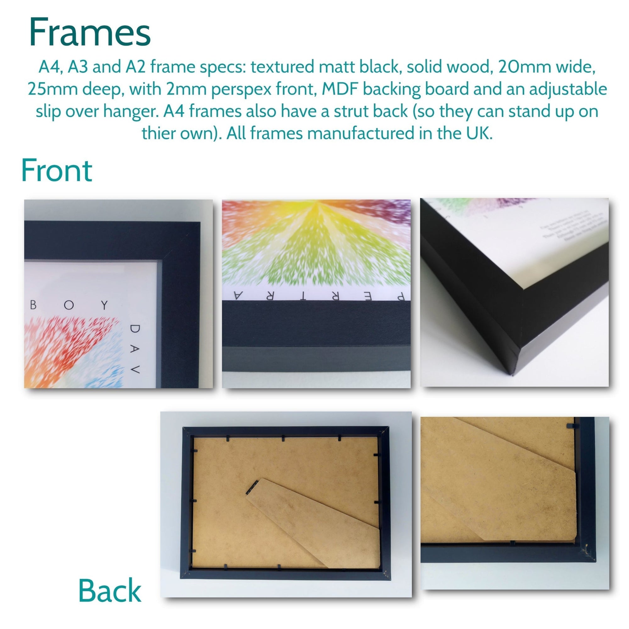 • framed prints are framed in 20mm wide, textured black frames. The frames are 25mm deep (from front to back), have mdf backing board, 2mm transparent perspex at the front (which won't crack or shatter in transit), and an adjustable slip over hanger. Frames are made of quality solid wood. A4 frames also have a strut back so you can either hang them on the wall or they will stand up on their own.