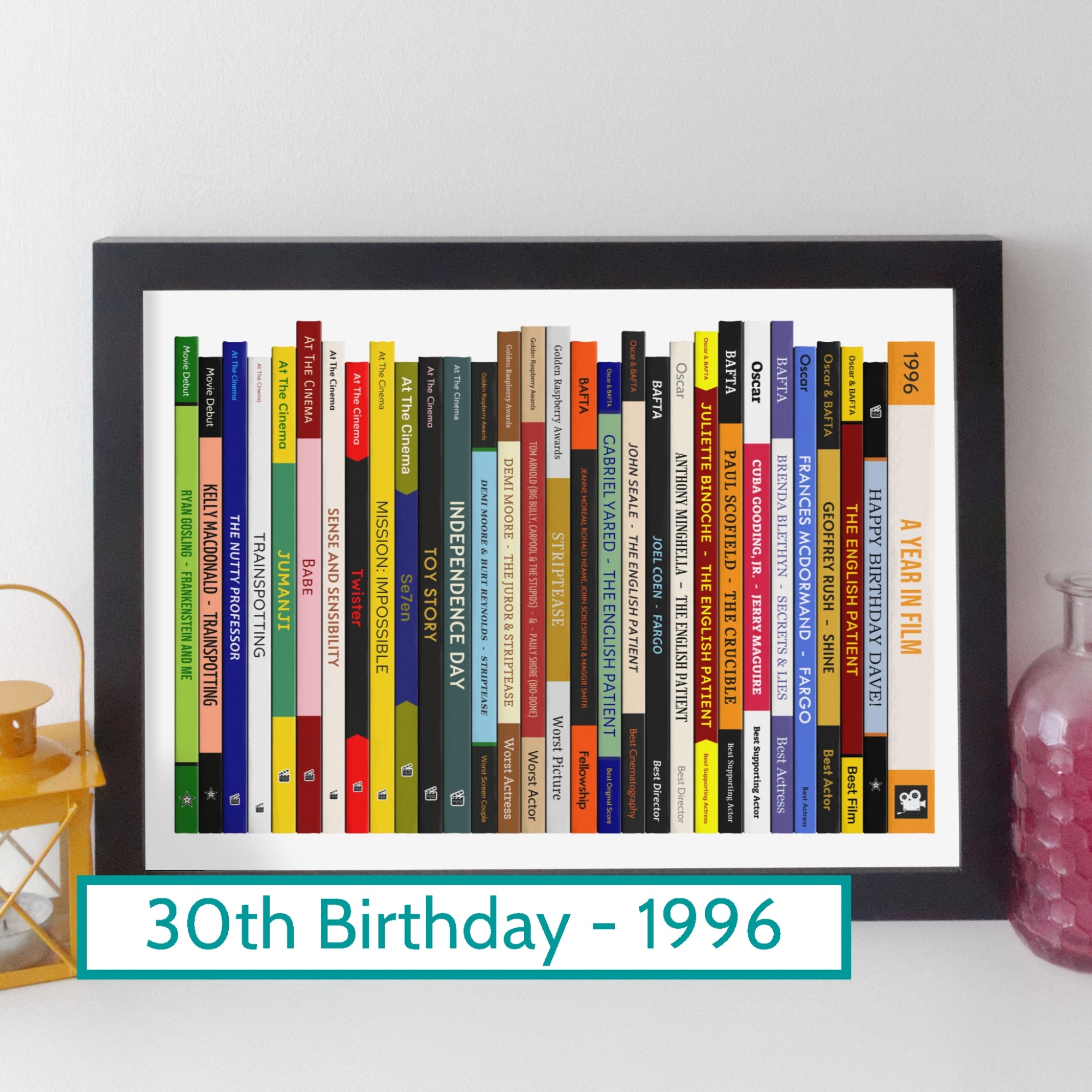 Celebrate the world of film with this personalised 1996 movie print, designed in the style of a row of books. Each “book” shows some fascinating film facts from 1996.  Facts such as Oscar, BAFTA and Golden Raspberry winners, top UK box office movies, and notable movie debuts.