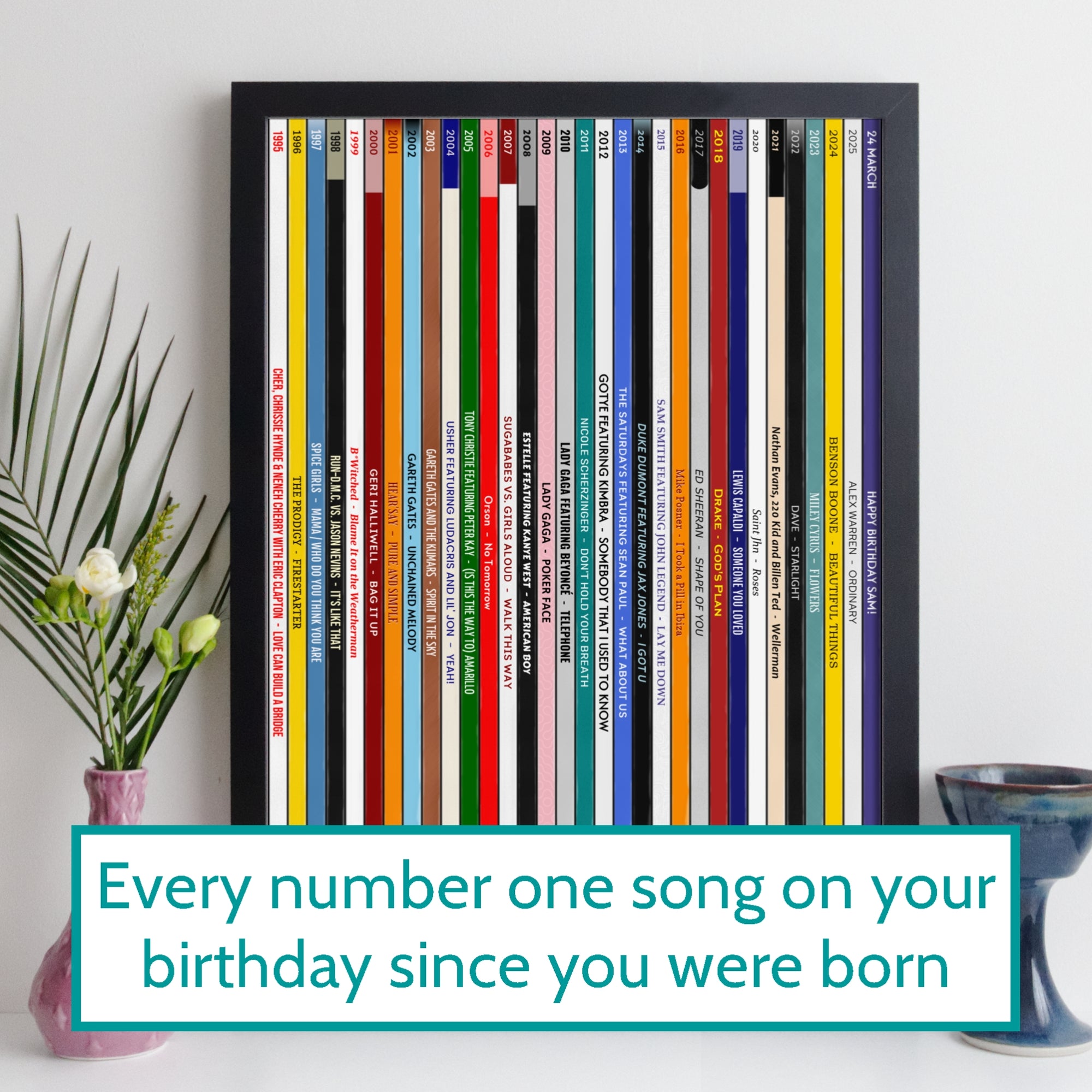 Includes number one songs from each year since 1996 (this print is suitable for birth years 1996, 1995, 1994 and 1993)