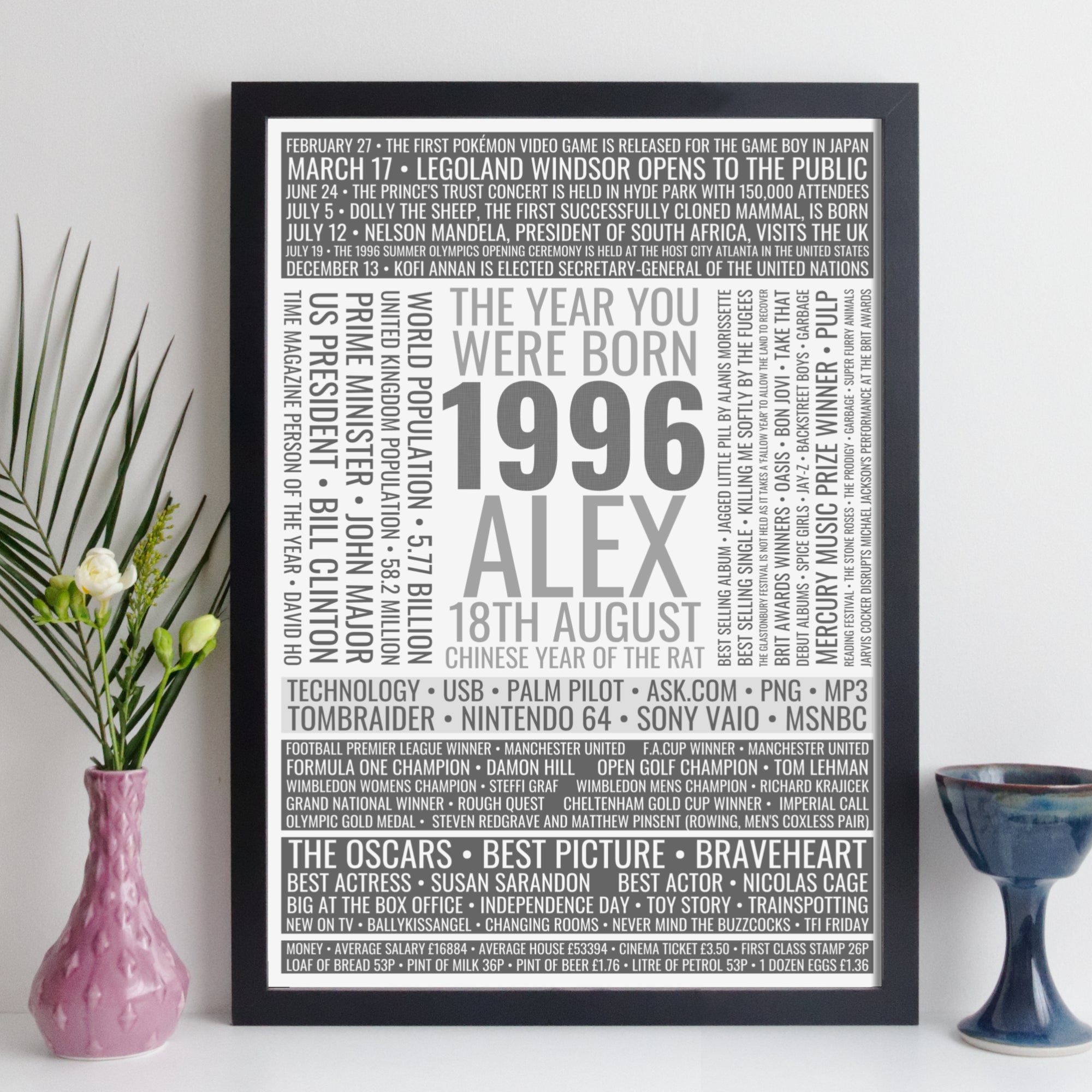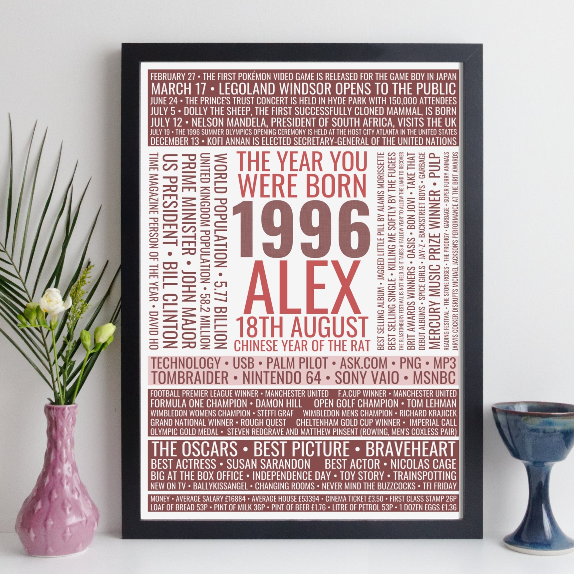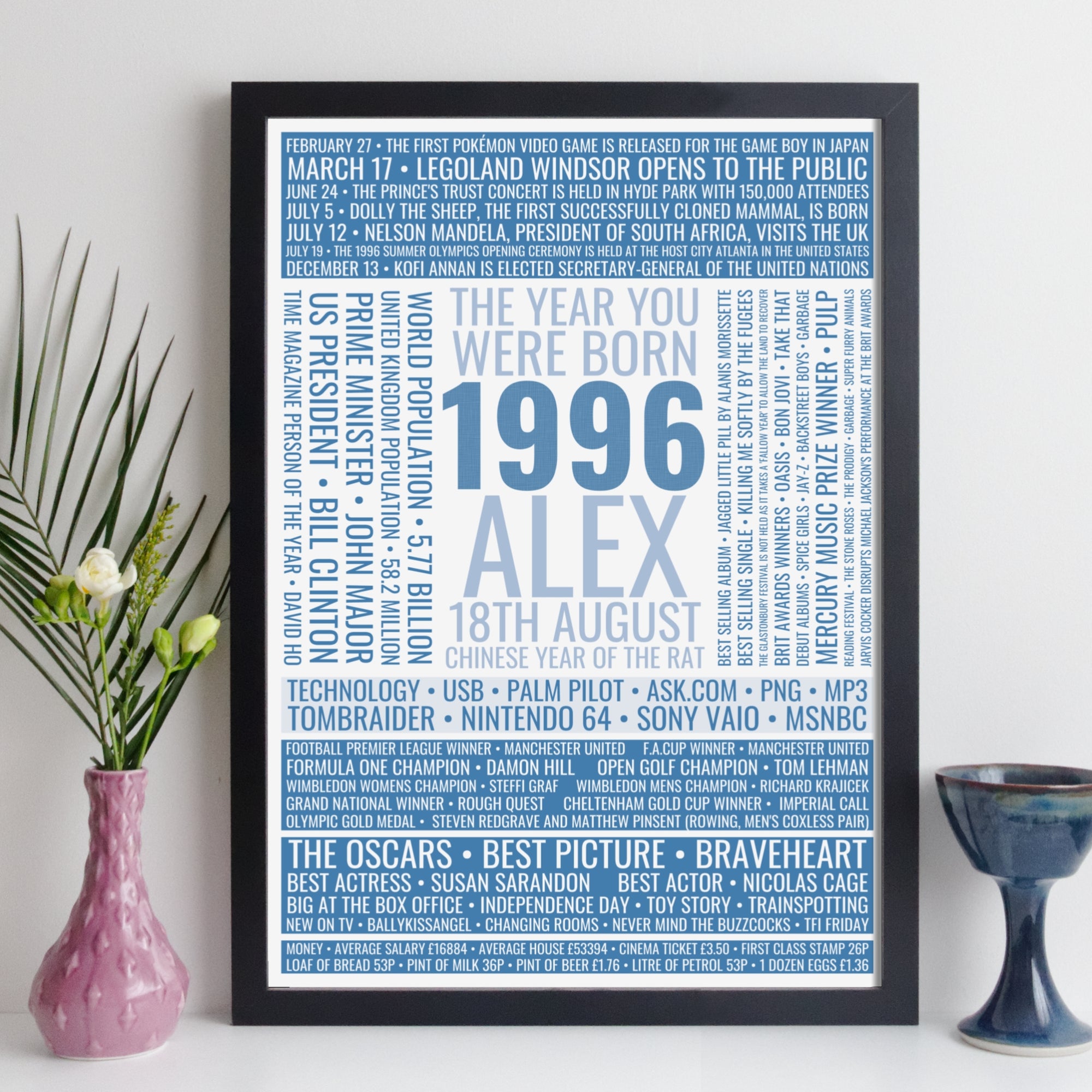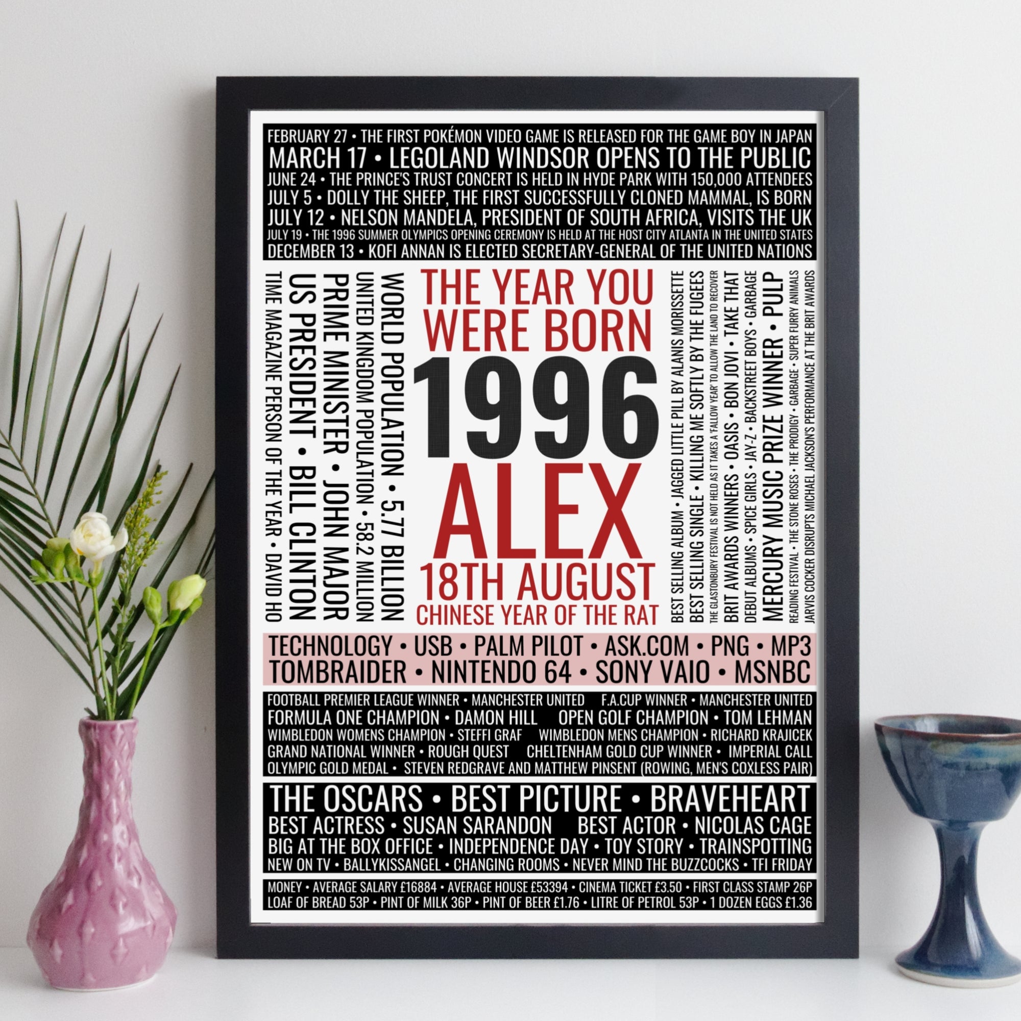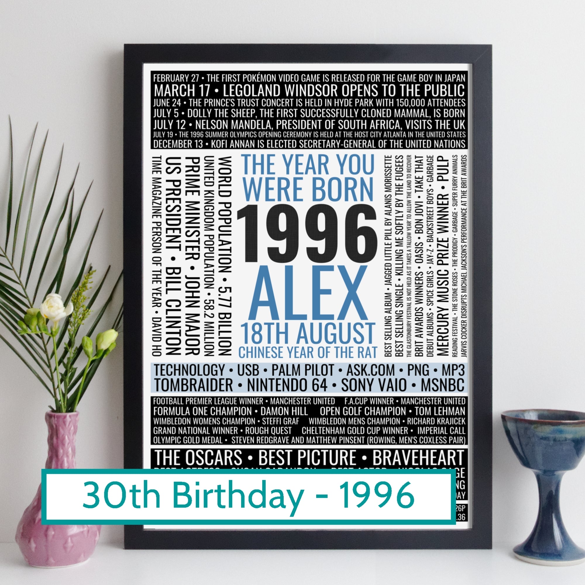 This fact-filled personalised wall art print celebrates all things 1996. It shows facts and trivia about a variety of topics: the worlds of movies and music, news and sports events, technology, money and more. It's a little piece of personal history for someone born in 1996, making it a great 30th birthday gift.