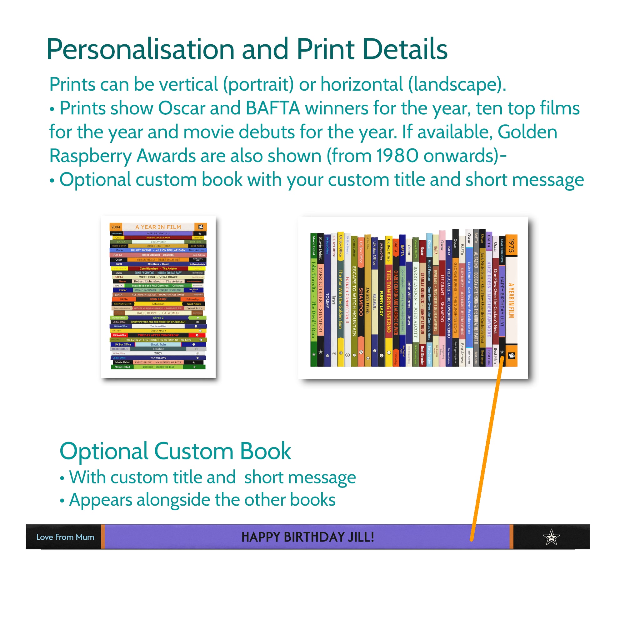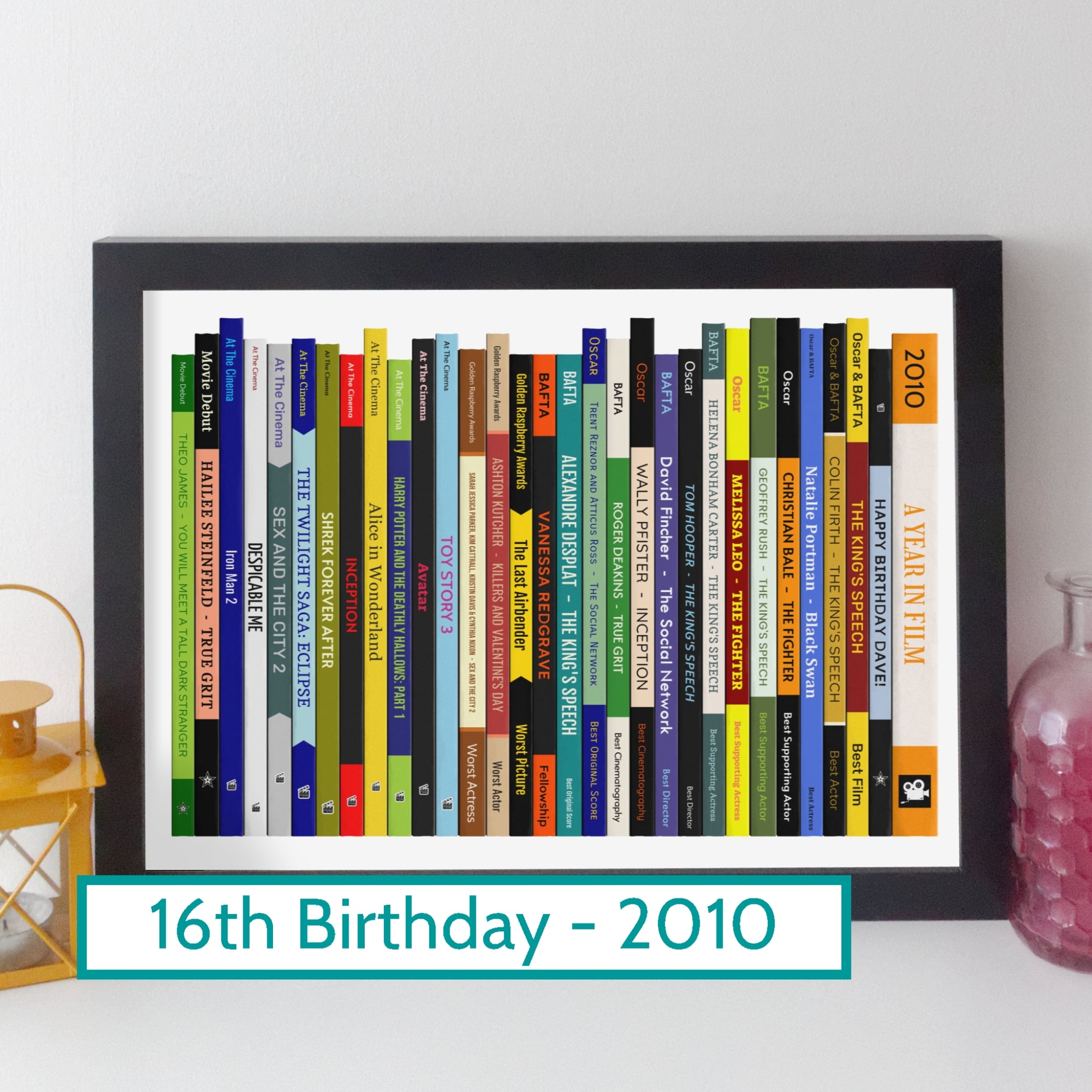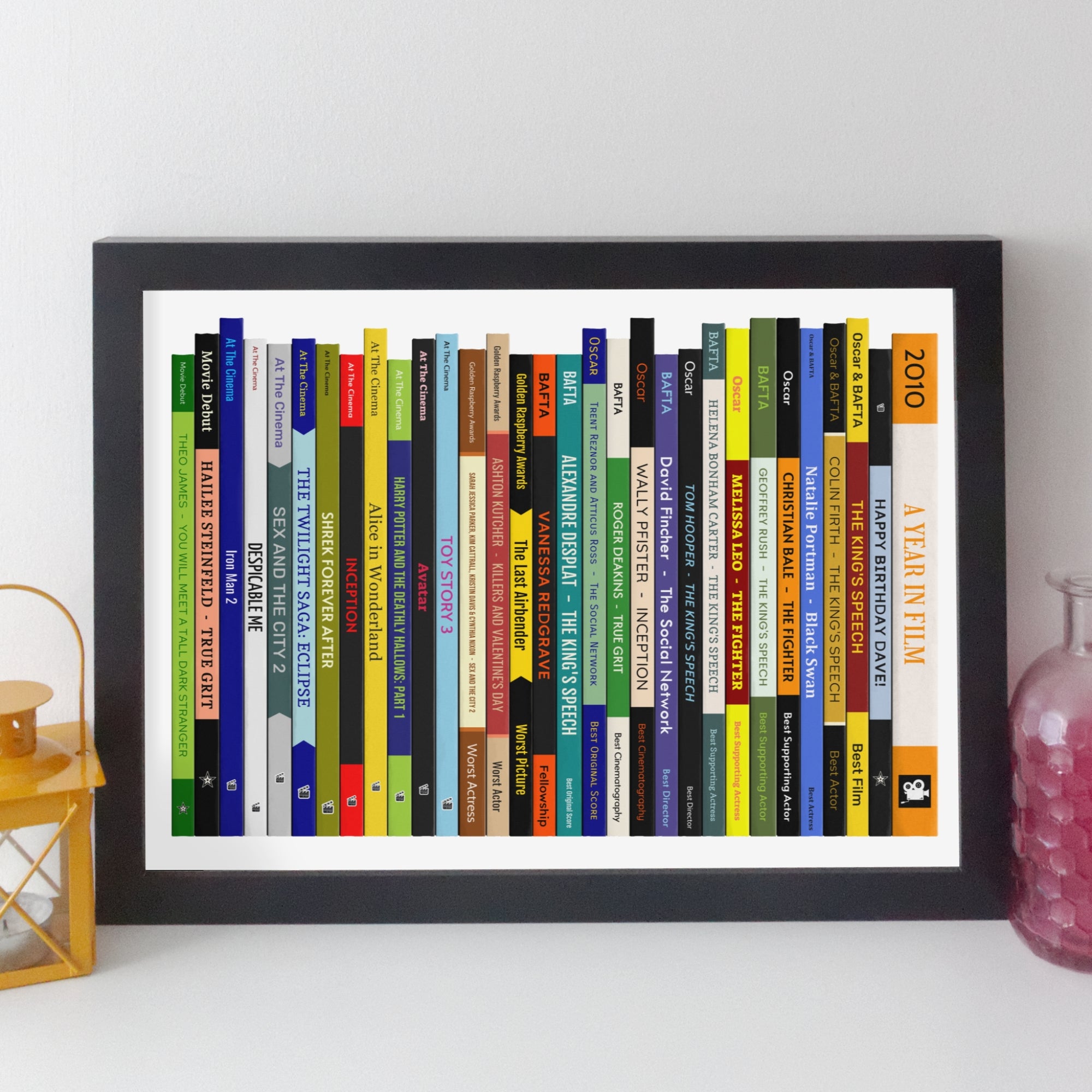 Explore the magic of the movies with this personalised 2010 movie print designed to look like a row of book spineson a shelf. Each “book” shows fascinating film facts from 2010 — such as Oscar and BAFTA winners, Golden Raspberry Award winners, top UK box office hit films, and memorable movie debuts.