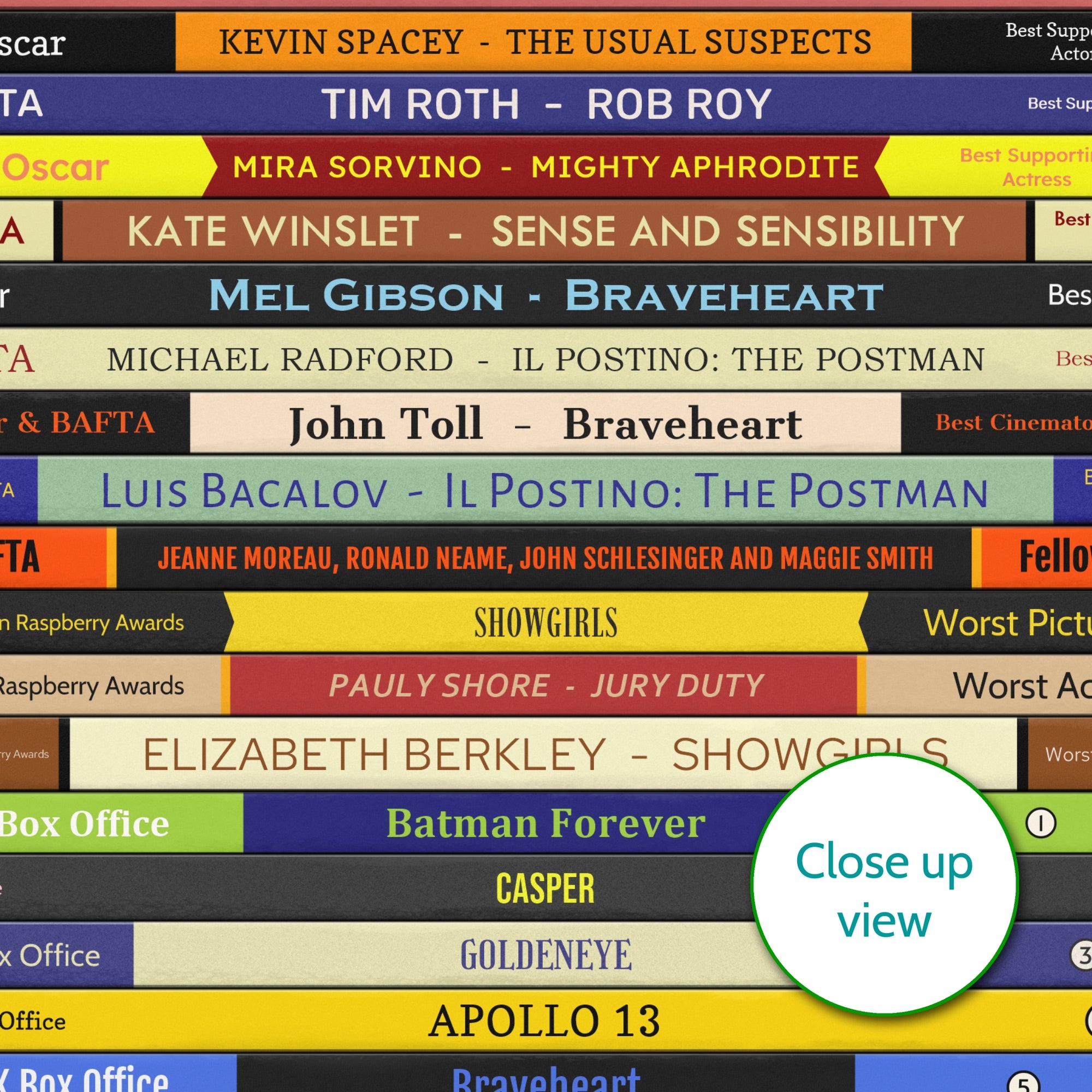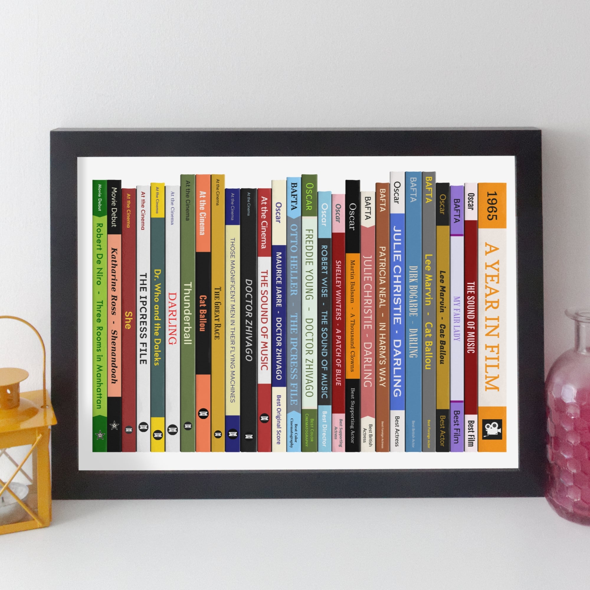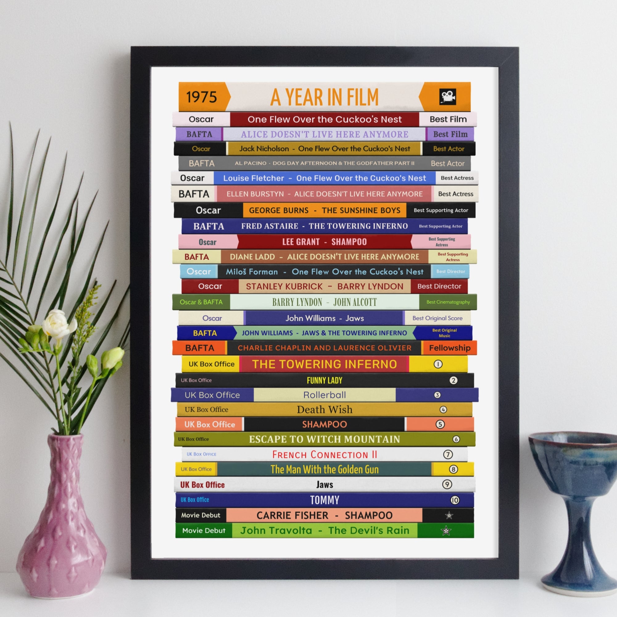 A personalised movie printthat celebrates any year you want (1965 and later). This print has a unique book design, where “book” shows fascinating movie facts from whatever year you choose. All years show major Oscar and BAFTA award winners, movies popular at theUK box office and notable movie debuts. Prints for 1980 onwards also show some of the Golden Raspberry Award winners.