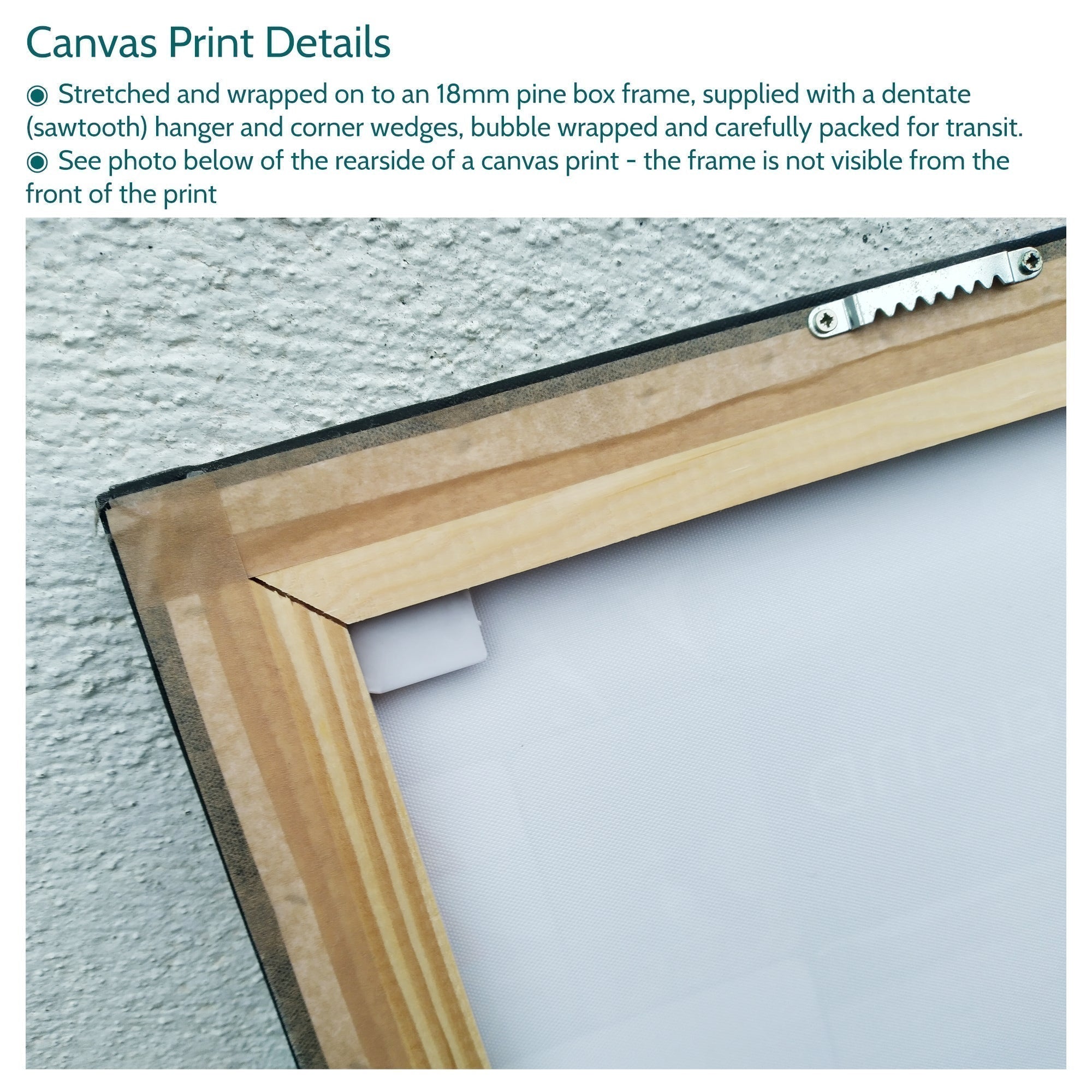 • canvas prints are ready to hang, the canvas is wrapped and stretched on an 18mm pine box frame (frame not visible from the front of the print)