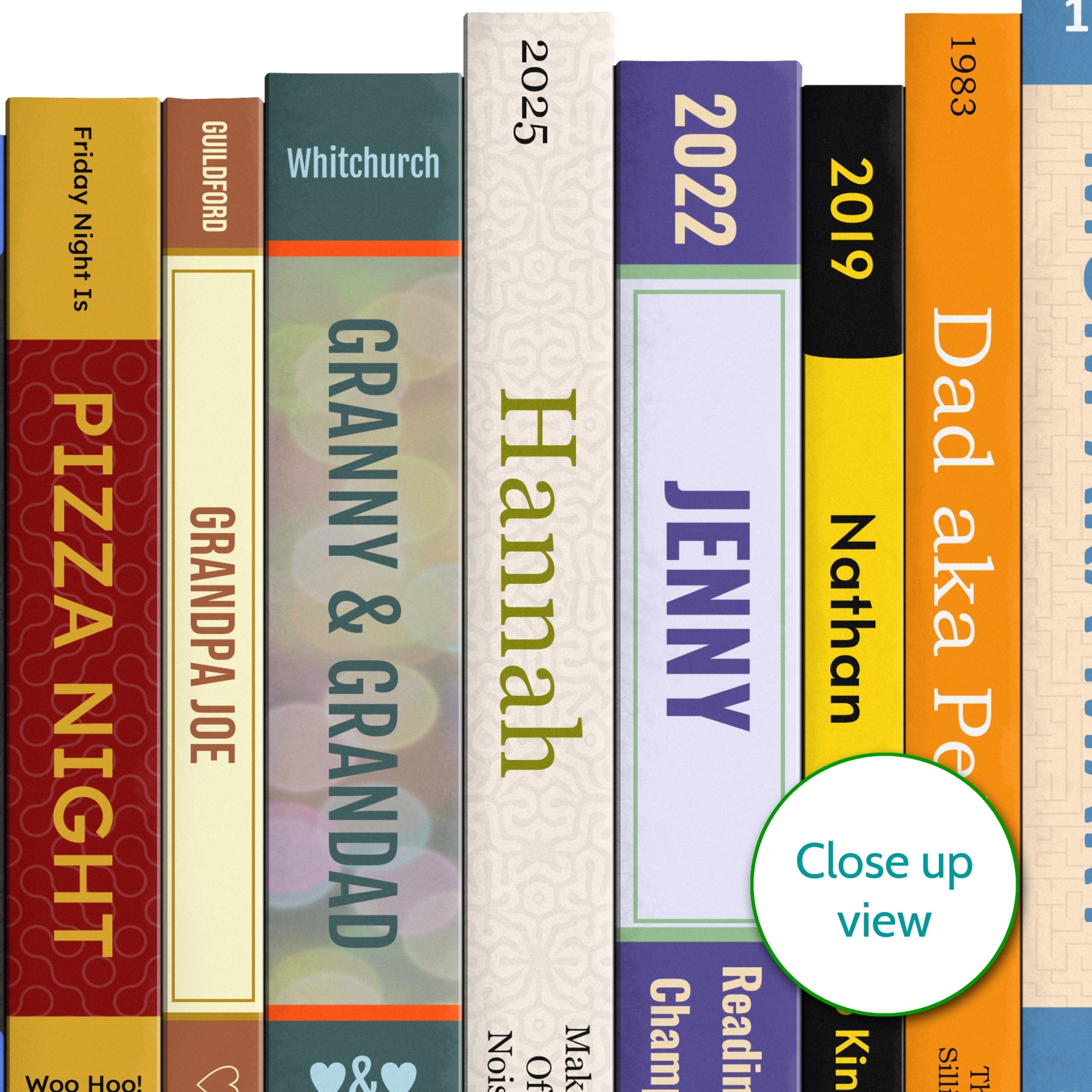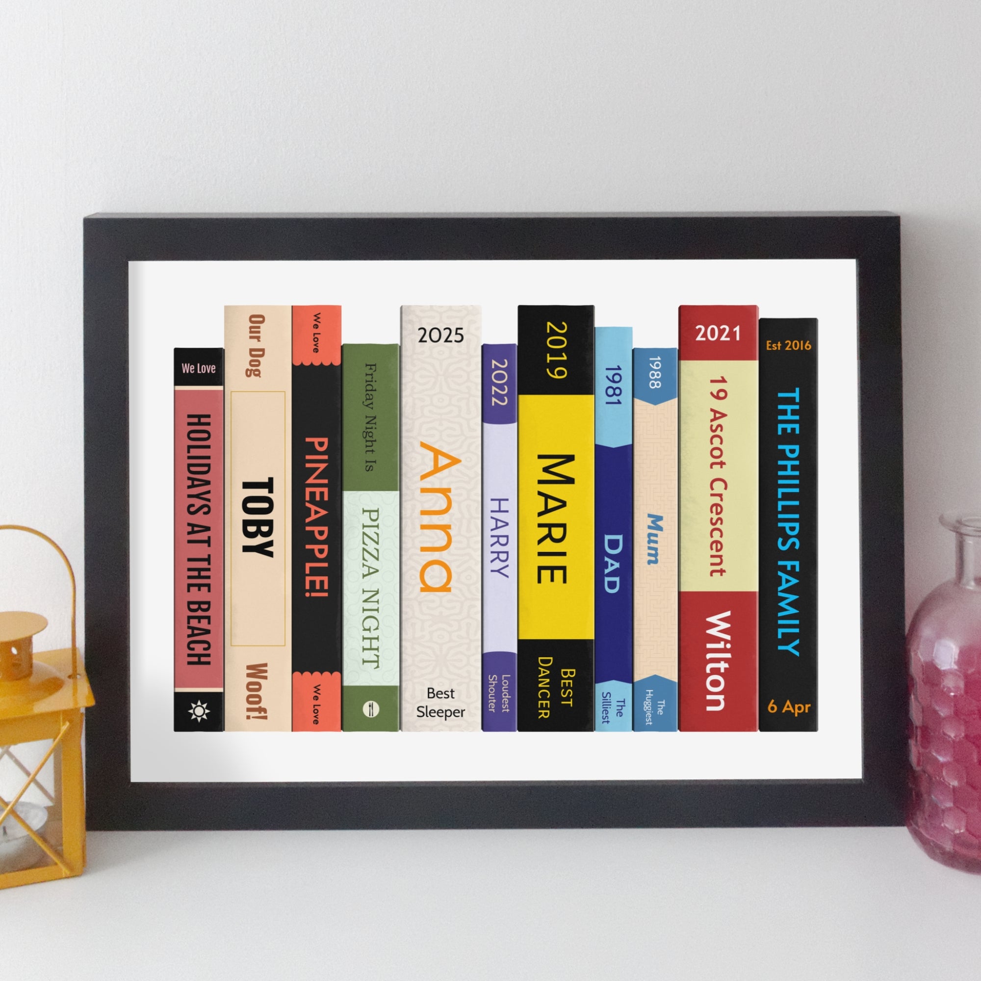 Celebrate all the family with this delightful print showing a row of books with special details just for them. Choose from their names, their pets, the things they love, the place they live, and anything else you want to celebrate about them. It's a very personal family gift and it's great fun.
