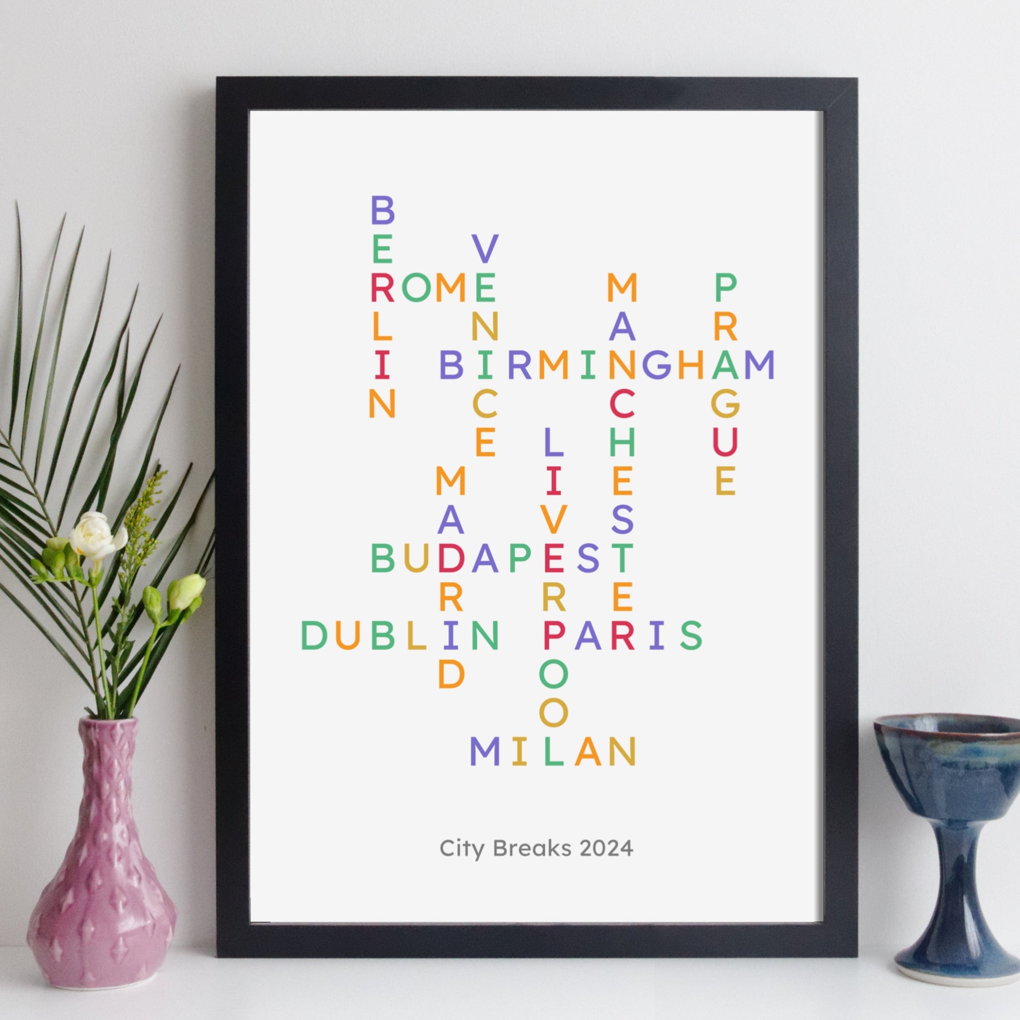 A personalised travel crossword print showing your choice of towns, cities or countries. You tell us the places, we design the crossword. A striking way to celebrate your travels or to display your travel bucket list.